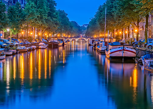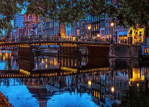 Reflections of a canal in Amsterdam, Netherlands