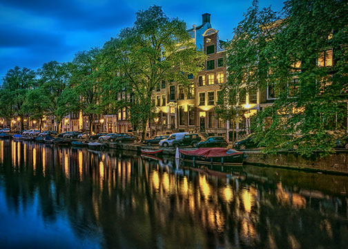 Reflections of homes in canal in Amsterdam, Netherlands